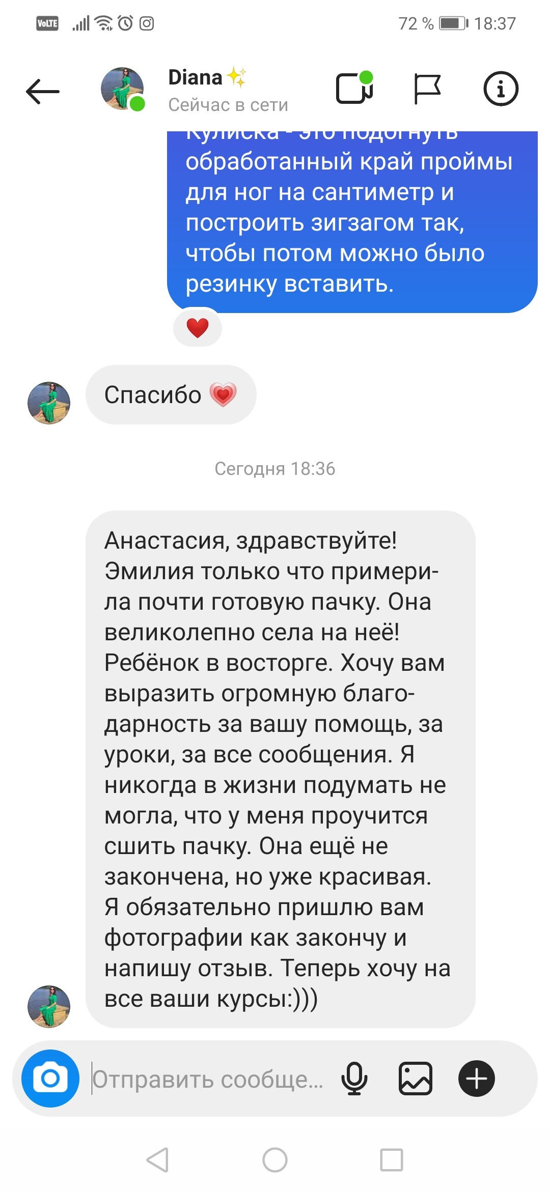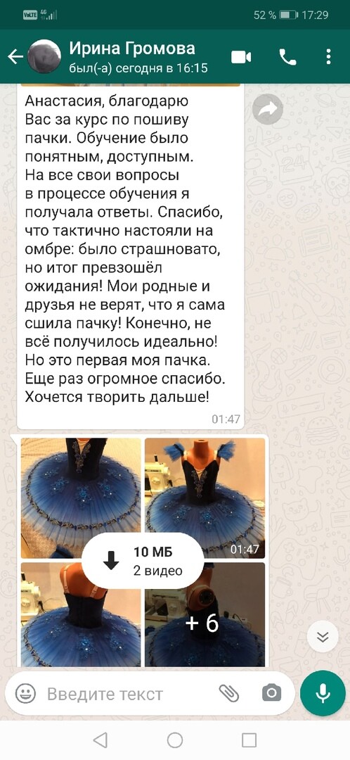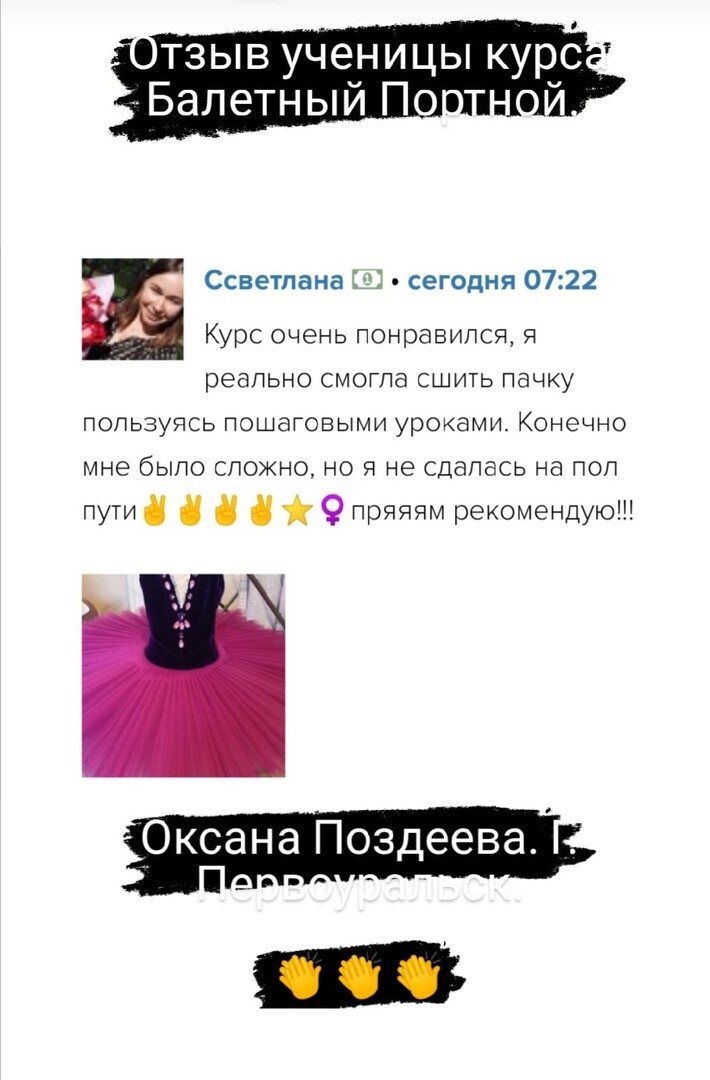 Обожаю свою профессию и готова делиться знаниями. Мной разработана методика пошива балетных костюмов, которая упрощает жизнь. Я убеждена, что шитье с удовольствием возможно, и мой курс именно об этом. Покажу, как легко сшить костюмы, в которых вам будут гарантированы призовые места на конкурсах. По своему опыту и опыту учеников могу с уверенностью сказать, что пошив балетных костюмов увлекает и вдохновляет своей красотой.